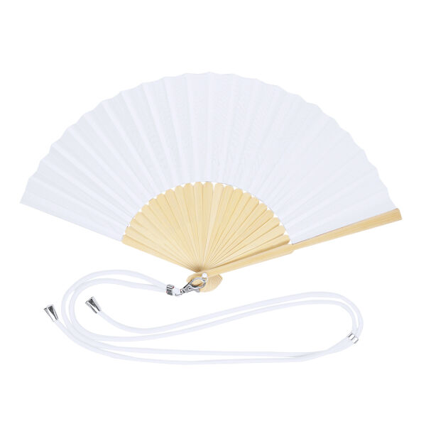 Waaier gemaakt van resistent polyester stof en flexibele bamboestokken. Het bevat een verstelbaar koord dat bij de stof past en een praktische metalen karabijnhaak voor gemakkelijk vervoer.