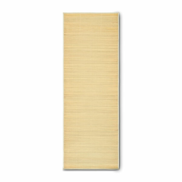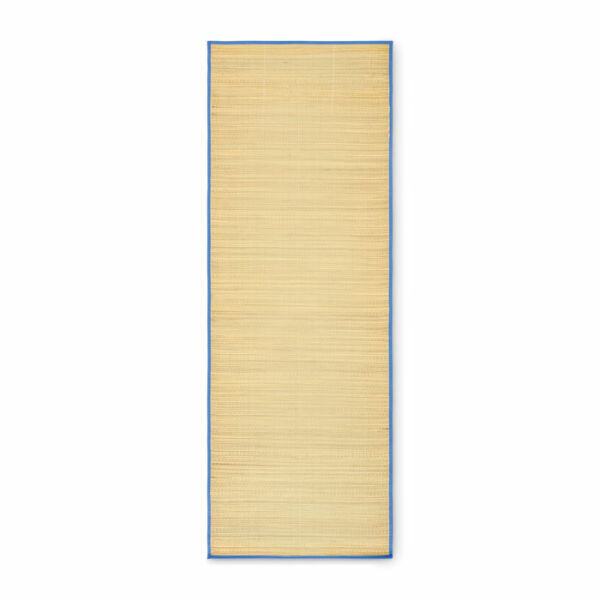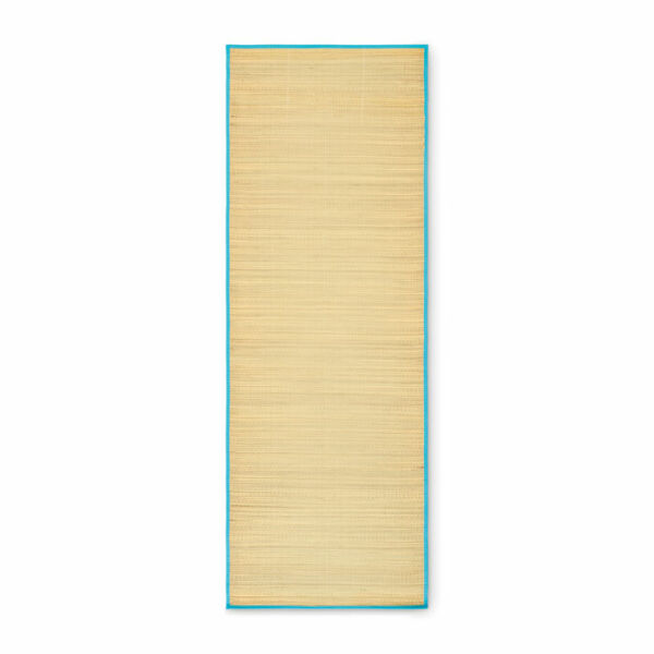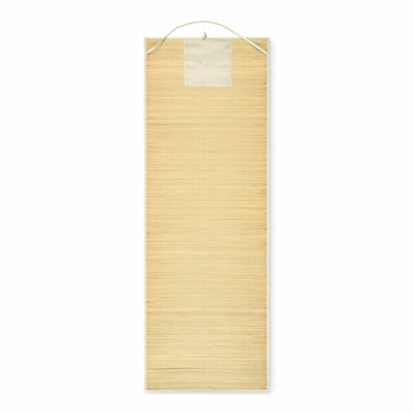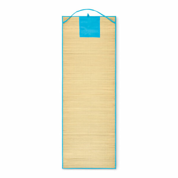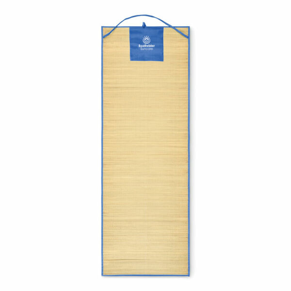 Oprolbare strandmat van natuurlijk stro met polyester draagriem.
