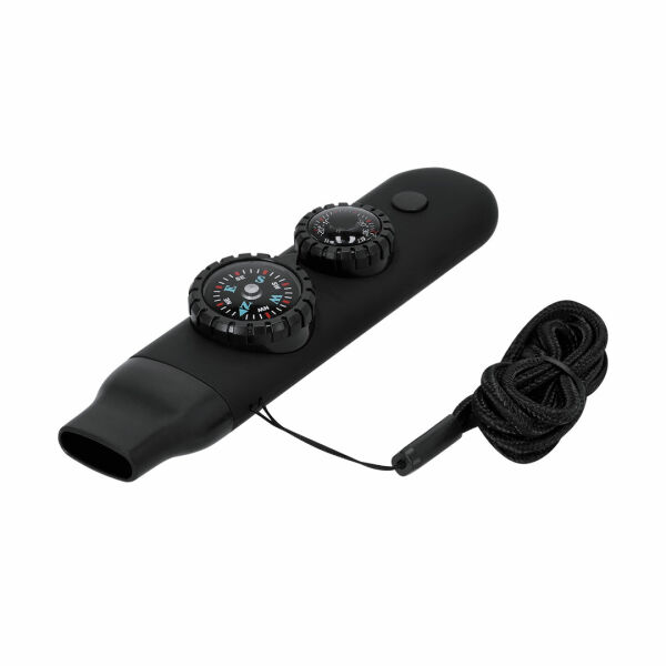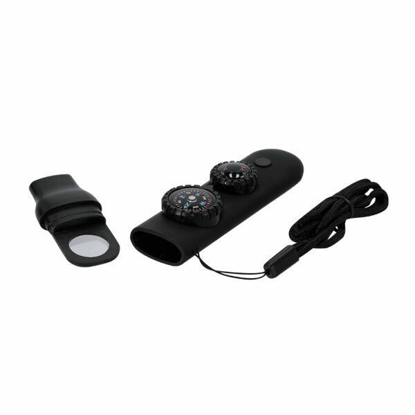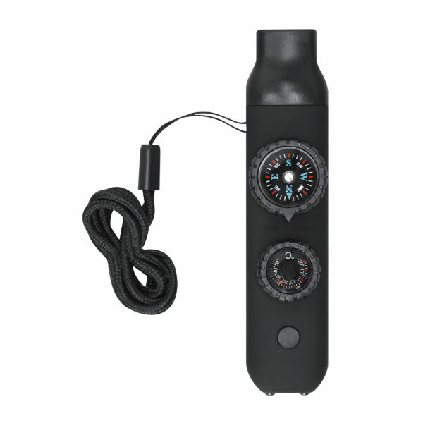 Survivalfluitje gemaakt van resistent ABS met een rubberachtige afwerking. Het integreert 6 essentiële functies: - Kompas van 2,55 cm in diameter, met aanduidingen van Noord, Zuid, Oost en West.- Krachtige fluit, ideaal voor het uitzenden van noodsignalen.- Thermometer met een temperatuurbereik van -20 ºC tot 50 ºC.- Vergrootglas van 2 cm diameter, perfect om kleine details te observeren of zelfs om vuur aan te steken door zonlicht te concentreren.- Spiegel, Ingebouwd onderaan het kompas.- Zaklamp met 2 leds en een aan/uit-knop bovenaan.Bevat een praktisch snoer voor gemakkelijk vervoer, ideaal om comfortabel om de nek te hangen.