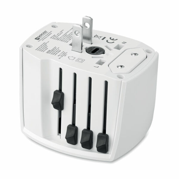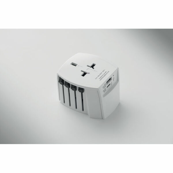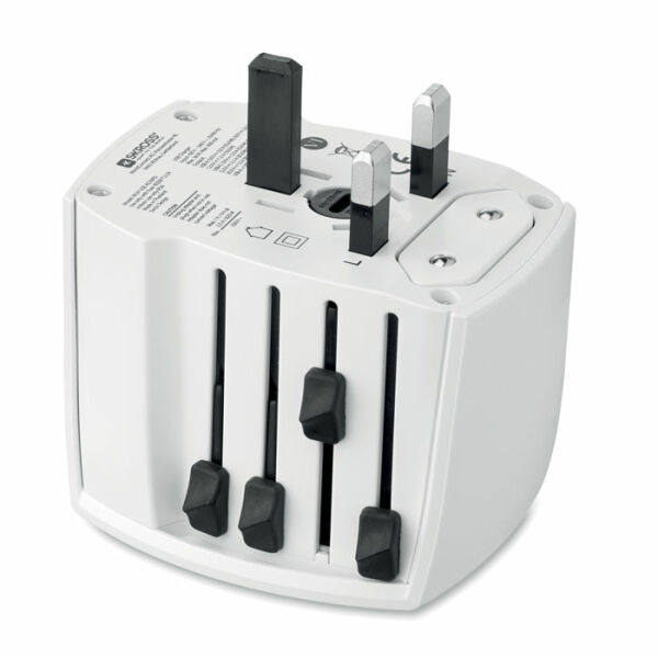 SKROSS® MUV USB — universele 2-polige reisadapter met USB-A- en Type-C-poorten. Levert 30 W via Type-C en 18 W via USB-A voor snel en veilig opladen, wereldwijd. Compact, krachtig en reisklaar.